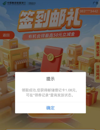 邮政银行“签到邮礼“,每月领立减金