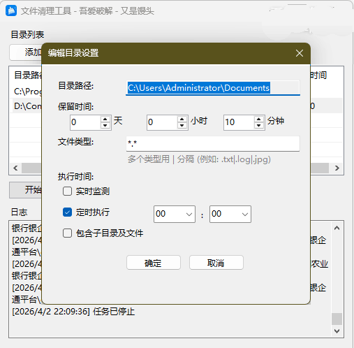 FileCleaner_n8.exe (约 147MB) 包含完整的 .NET 运行时 可在未安装 .NET 的系统上独立运行 体积较大,但兼容性更好 使用方法 添加清理目录及相关设置 点击 添加目录 按钮,在弹出的对话框中选择要清理的目录 设置文件保留时间,设置全为0表示不保留文件。 输入要清理的文件类型,.代表所有类型,多个类型用分号分隔,如 .txt|.log|.jpg 实时监测与定时执行两种执行方式互斥,实时监测每分钟执行一次清理,定时执行则在预约时间执行一次清理。 包含子目录及文件,如果勾选,则支持递归处理子目录下的文件 查看日志 软件界面下方的 日志 区域会实时显示清理过程和结果 同时,日志会自动保存到程序目录的 FileCleaner.log 文件中,方便后续查看